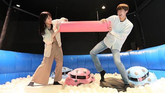 ガンダムアイテムが浮いたプールで相手とぽかぽか棒で押し相撲!©創通・サンライズ